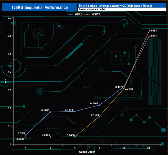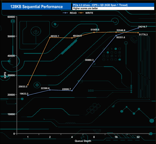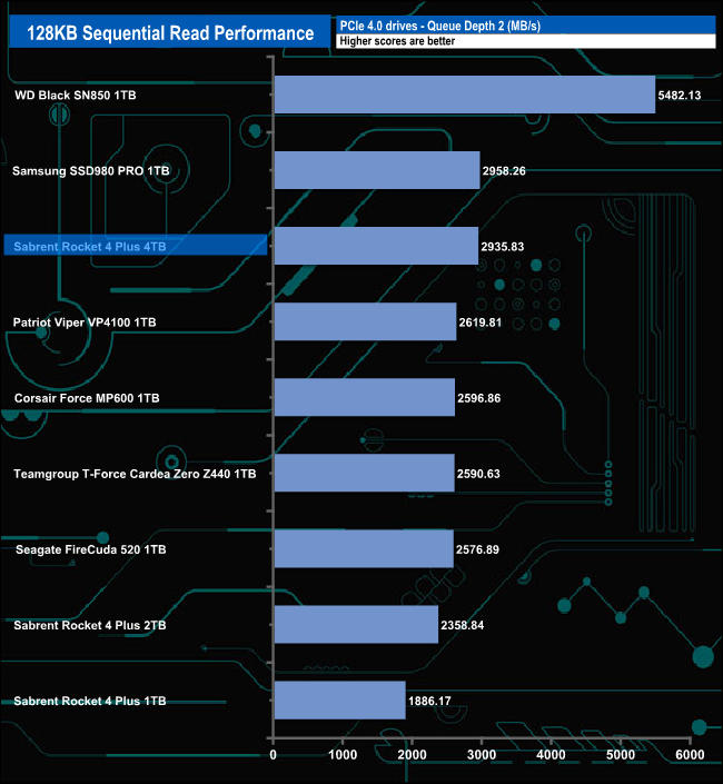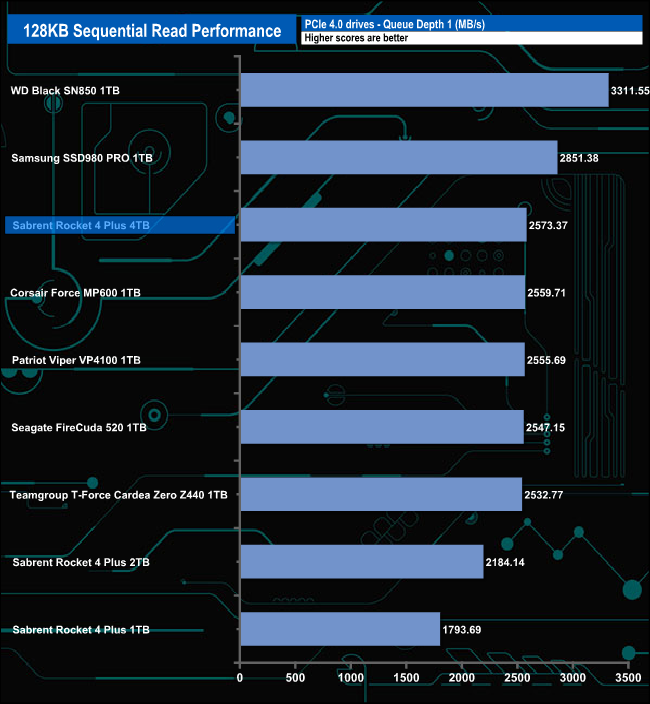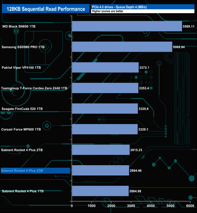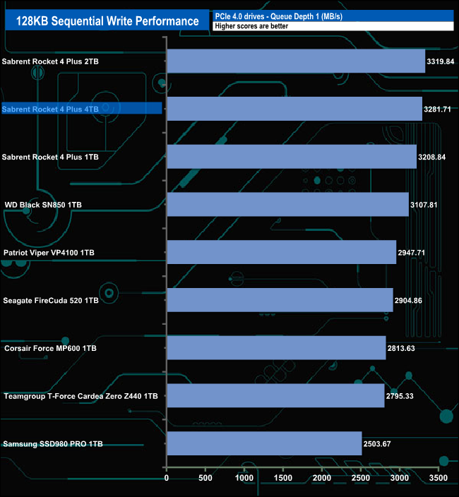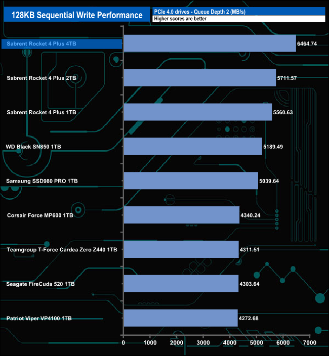 When it came to the Sequential write tests, the 2TB version of the drive was faster at QD1 but after that its the 4TB Rocket 4 Plus drive that rules the roost.