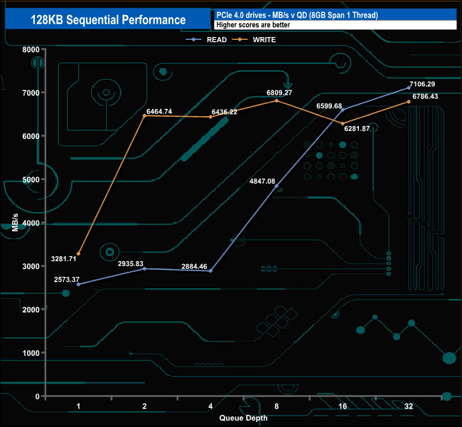 With our own Sequential tests, we couldn’t quite hit the official maximums for either read or writes. Our read result of 7,106.29MB/s isn’t too far short of the official 7,200MB/s while the write score of 6,786.43MB/s is a bit further off the official 6,900MB/s.