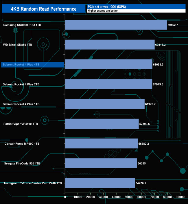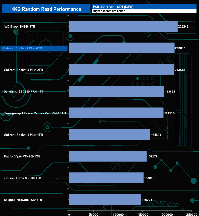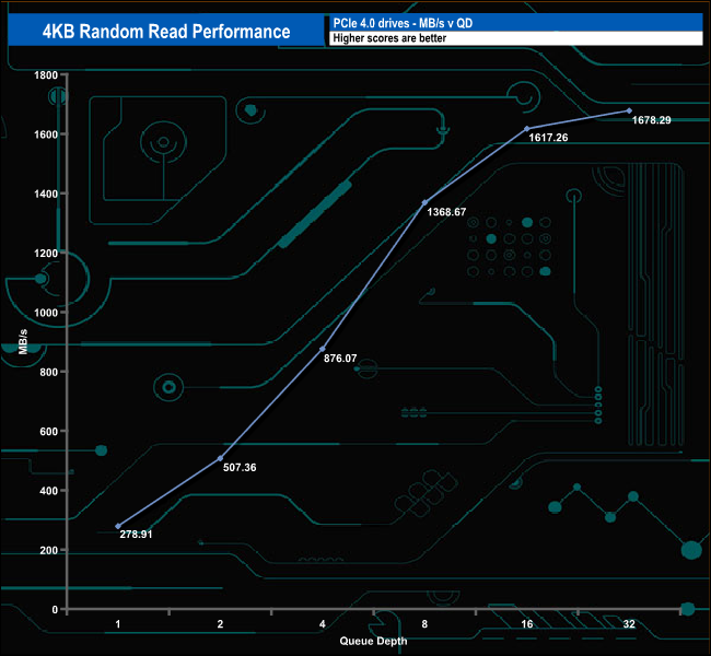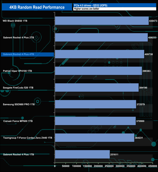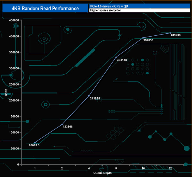 Sabrent quote a maximum 4K random read figure for the drive of 650,000 IOPS. The best we saw from the drive using our own 4-threaded tests was 409,738 IOPS (1,678.29 MB/s) at a QD of 32.
