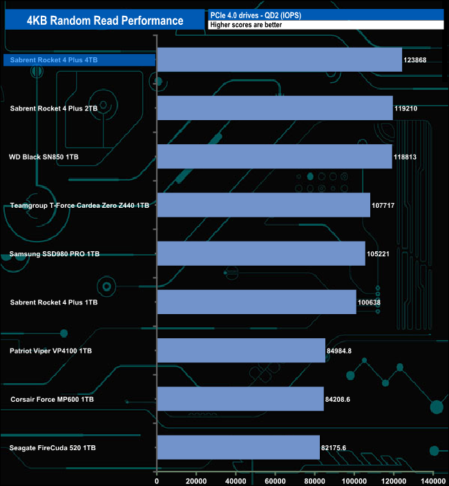 Sabrent’s Rocket 4 Plus sits in third place in our random read charts behind the WD Black SN850 and Samsung SSD980 PRO at a QD of 1 while it tops the chart at QD2. QD4 sees it sitting behind the WD drive again while at QD32 its sits behind both the WD drive and the 2TB version of the Rocket 4 Plus.