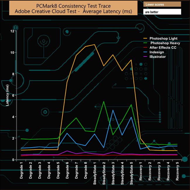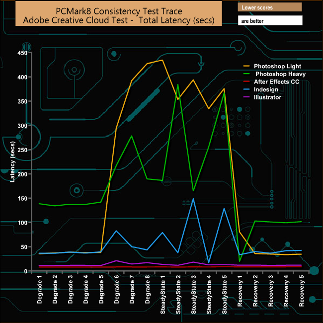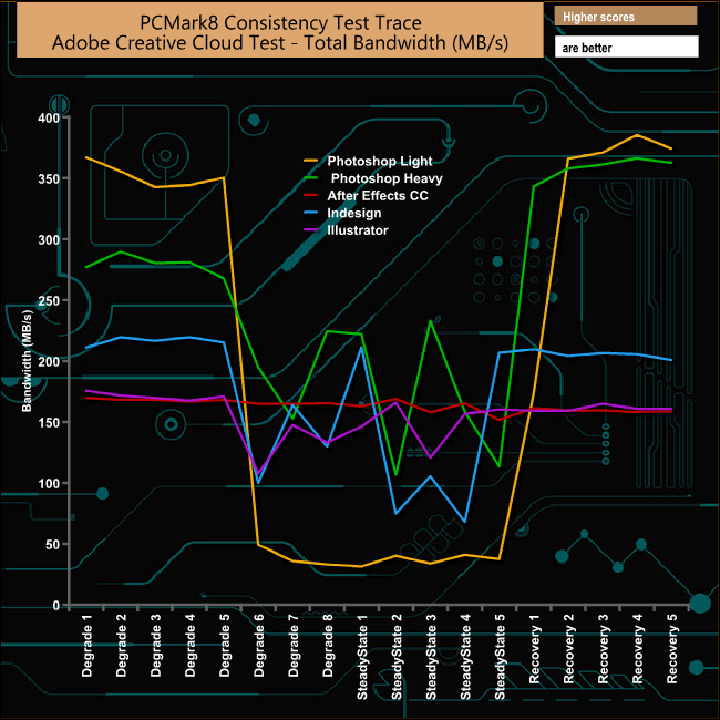 Unusually it's the Adobe Photoshop Light trace tests rather than the Photoshop Heavy tests that causes the drive the most problems, with a huge drop in bandwidth towards the end of the Degradation stages and on through the Steady State test phases, but it does recover very quickly.