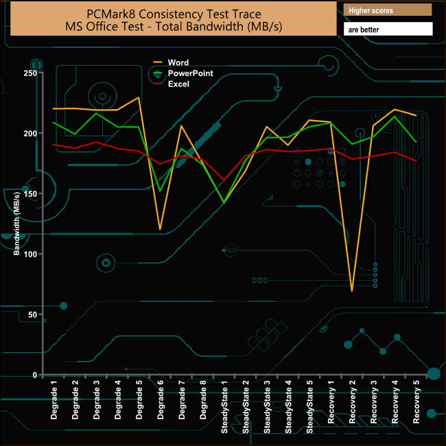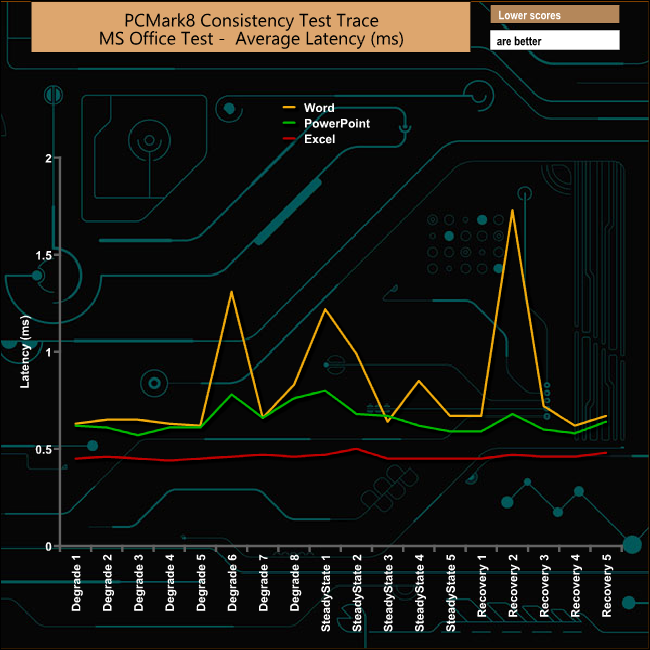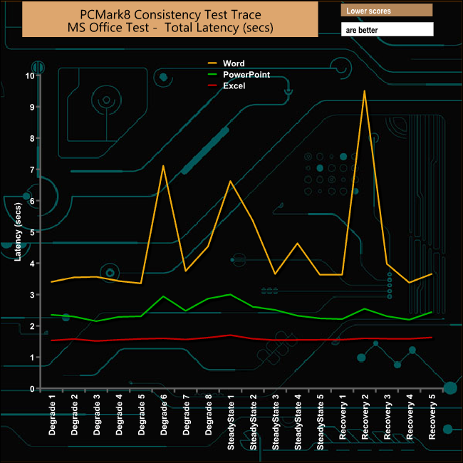 As usual it's the Word trace that gets hit hardest during the test. Oddly, though, it suffers the most during the second stage of its recovery run.