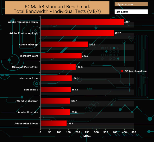 Just like the Consistency test, PCMark 8’s Standard Storage test also saves a large amount of performance data. The default test runs through the test suite of 10 applications three times. Here we show the total bandwidth performance for each of the individual test suites for the third and final benchmark run.