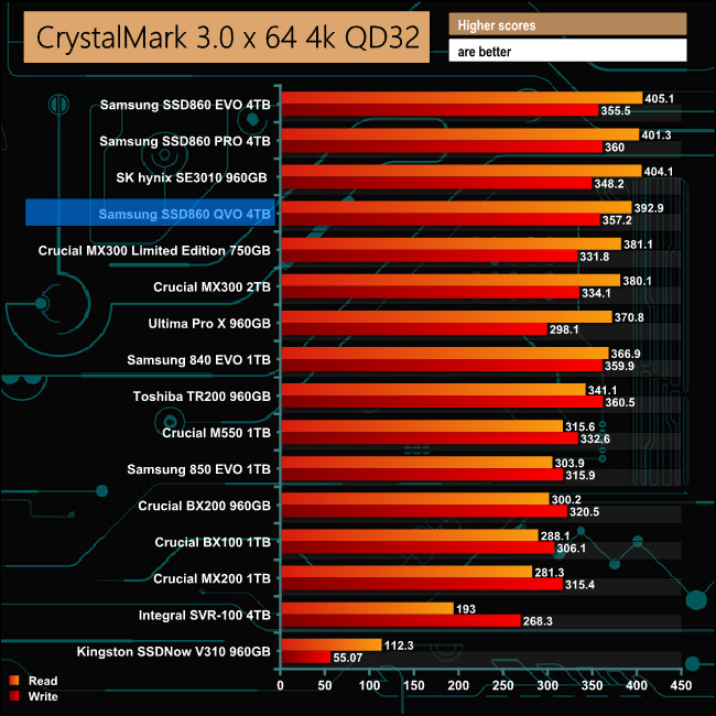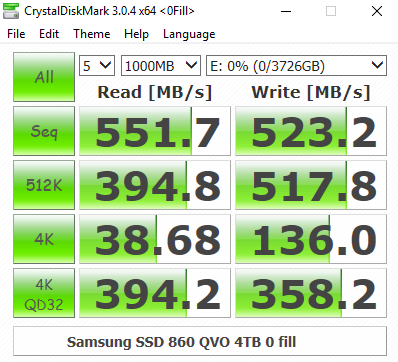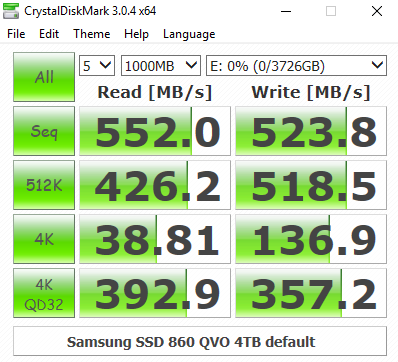 Testing the SSD 860 QVO with CrystalDiskMark, we see that the drive falls just short of the other two 4TB SSD 860 drives we have tested when it comes to reads. When it comes to writes it sits between the 860 EVO and the 860 PRO.