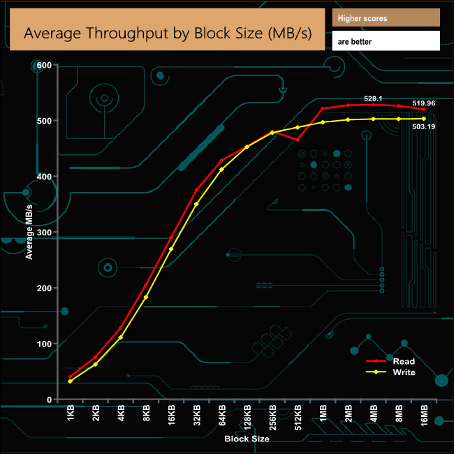 In our throughput tests the peak read figure came at the 4MB block mark, at 528MB/s, while peak writes came at the end of the test at 503MB/s. Both of these results are a little short of the maximum figures quoted by Samsung; 550MB/s for reads and 520MB/s for writes.