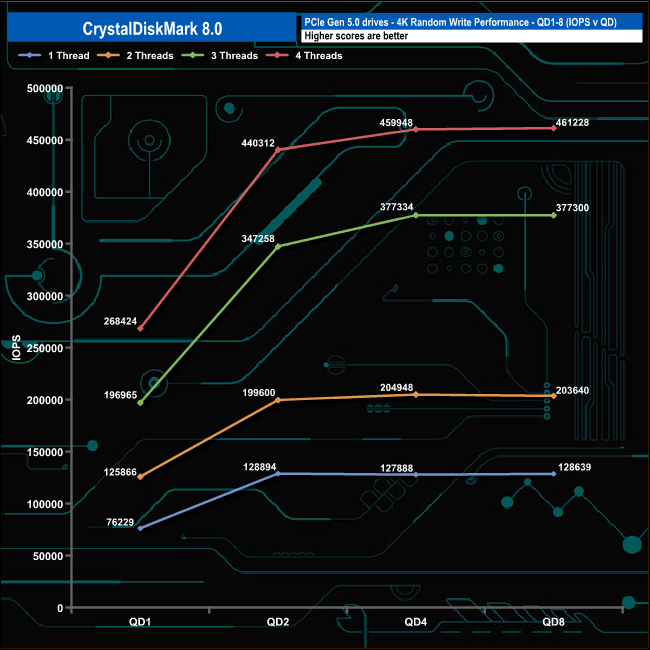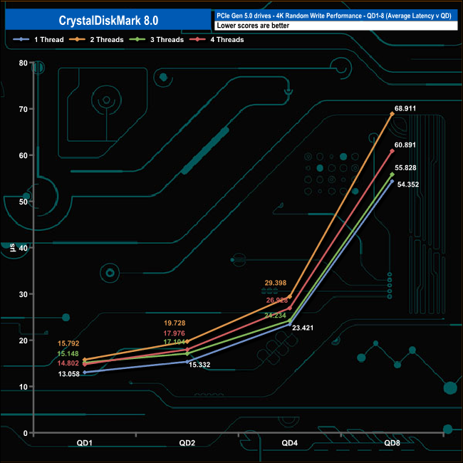 We used CrystalDiskMark 8 to test the random performance of the drive at lower queue depths (QD1 – QD8 where most of the everyday workloads occur) using 1 to 4 threads.