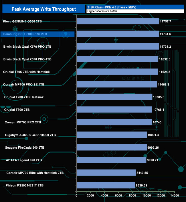 The peak write result of 11,731MB/s is a fair way short of the official maximum of 13,400MB/s but it's still good enough to put the drive into second place in the results table.