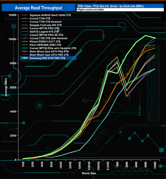 In our read-throughput test, the drive peaked at the 8MB block size at 10,284MB/s, quite some way short of the official maximum of 14,700MB/s.