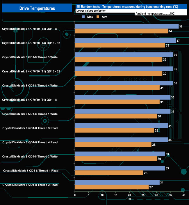 The hottest the drive got was the CrystalDiskMark 8 0 fill Read test where it reached 46° C. For the bulk of our testing, the drive averaged 40° C with the 4K focussed tests averaging 35° C.
