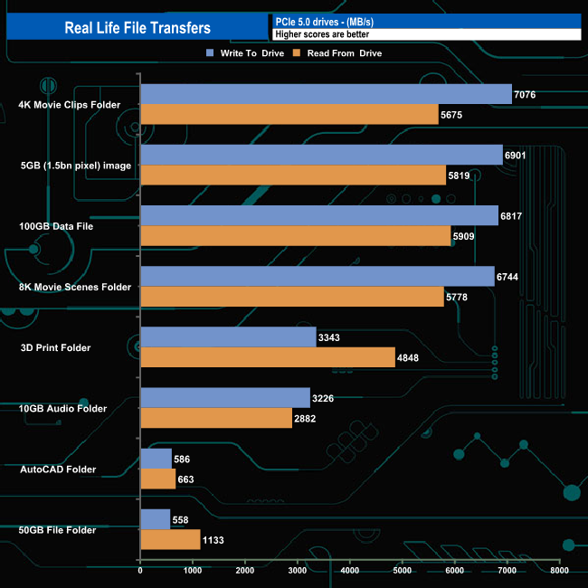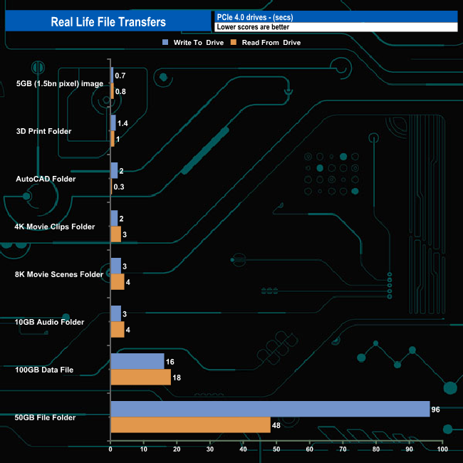 The 2TB Samsung SSD 9100 Pro averaged 4,406MB when writing the 8 transfer tests, with the fastest being the 7,076MB/s for the 4K movie folder with the slowest being the 50GB File Folder transfer at 558MB/s (96sec). Reading back the data the average was 4,088MB/s with the 100GB data file transfer being the fastest at 5,909MB/s.