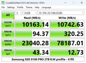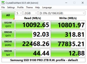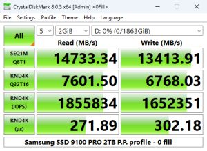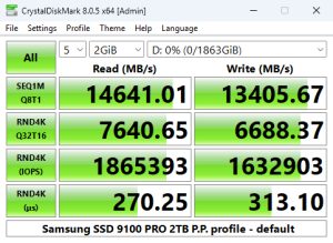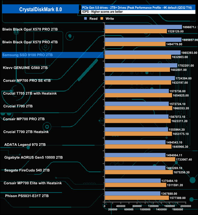 When it came to 4K performance, our test results were mixed. The read performance of the 2TB SSD 9100 Pro is quoted as up to 1,850,000 IOPS, which we could confirm with CrystalDiskMark 8's Peak Performance Profile tests with a result of 1,865,393 IOPS, which sees the drive slotting into third spot on the results chart. On the other hand, the write test result of 1,632, 903 IOPS was some way back from the official maximum of 2,600,000 IOPS.