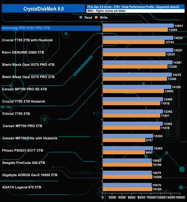 Using CrystalDiskMark 8's Peak Performance Profile we could, once again, confirm the official Sequential read / write figures with a test result of 14,641MB/s for reads and 13,405MB/s for writes, which are good enough to put the drive in top spot on the table.