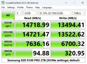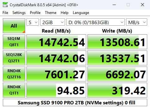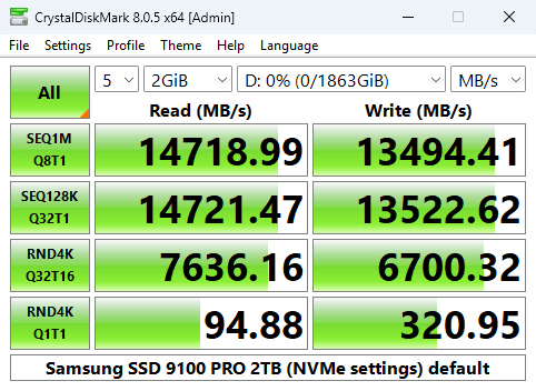 With the CrystalDiskMark 8 default test, we could confirm the official Sequential performance figures of up to 14,700MB/s and up to 13,400MB/s for reads and writes respectively with test results of 14,718.99MB/s for reads and 13,494.41MB/s for writes.