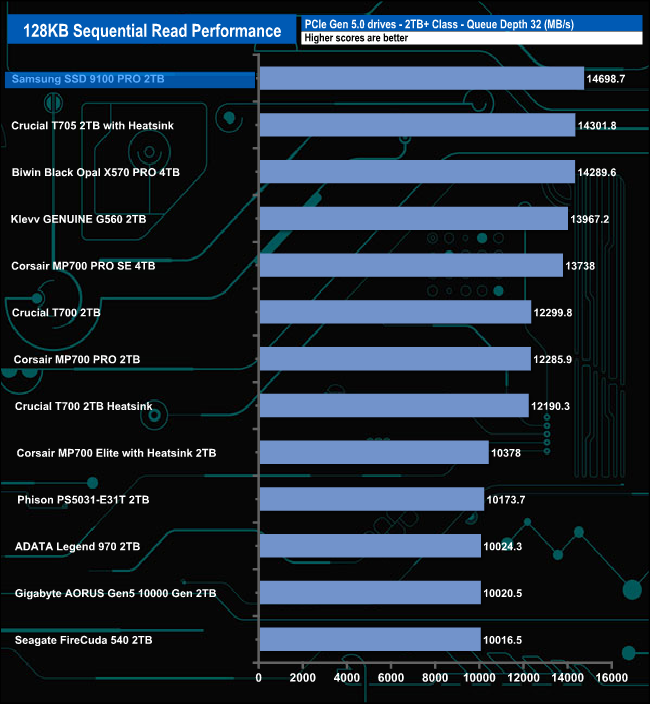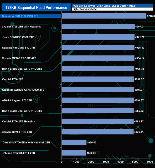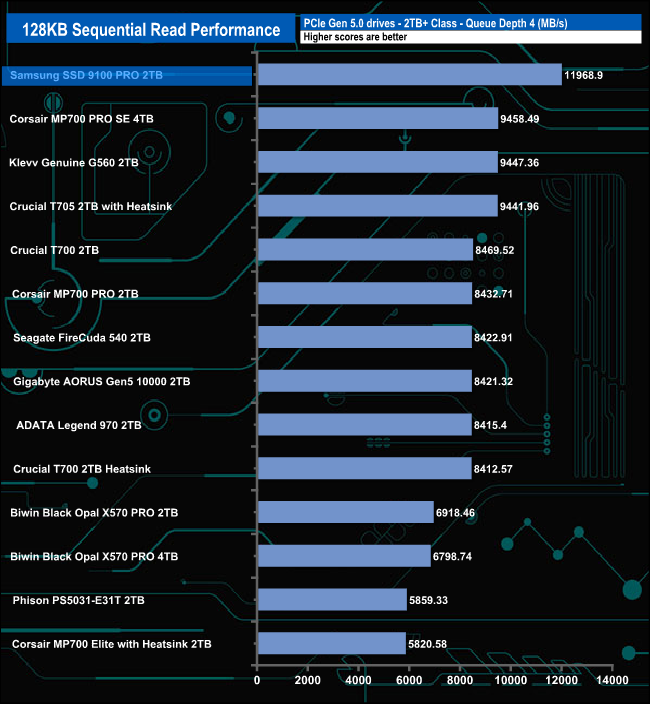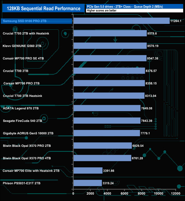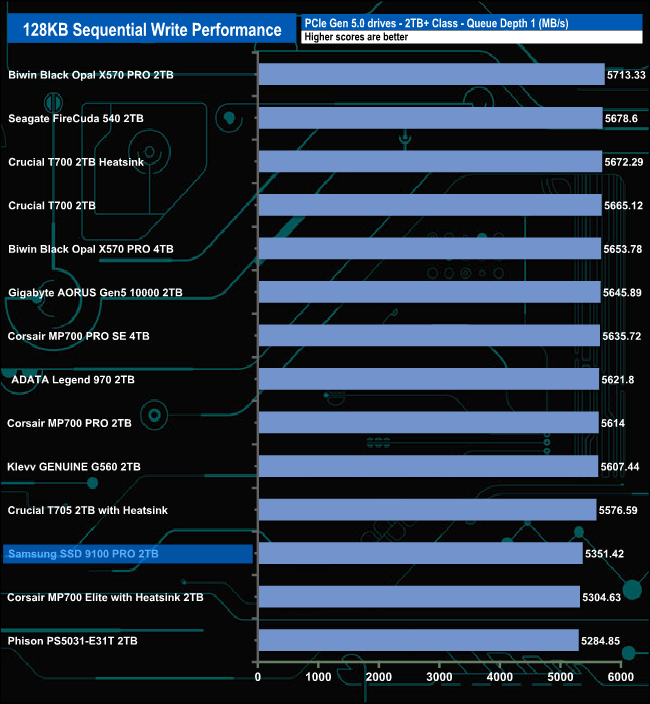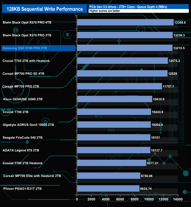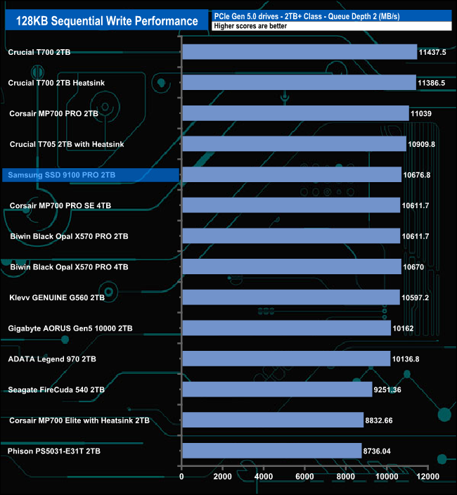 The drive takes top spot in every queue depth we tested at and by quite a margin at QD's 1, 2 and 4. However, at QD32 the gap between the Samsung SSD 9100 Pro and the rest is very much narrower.