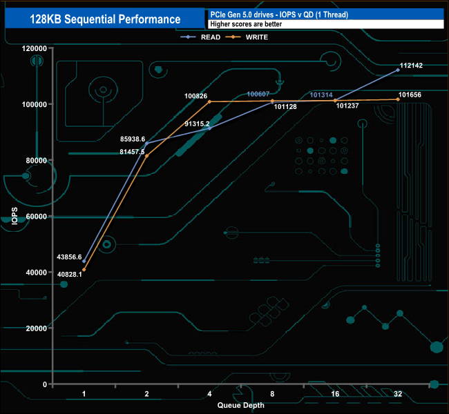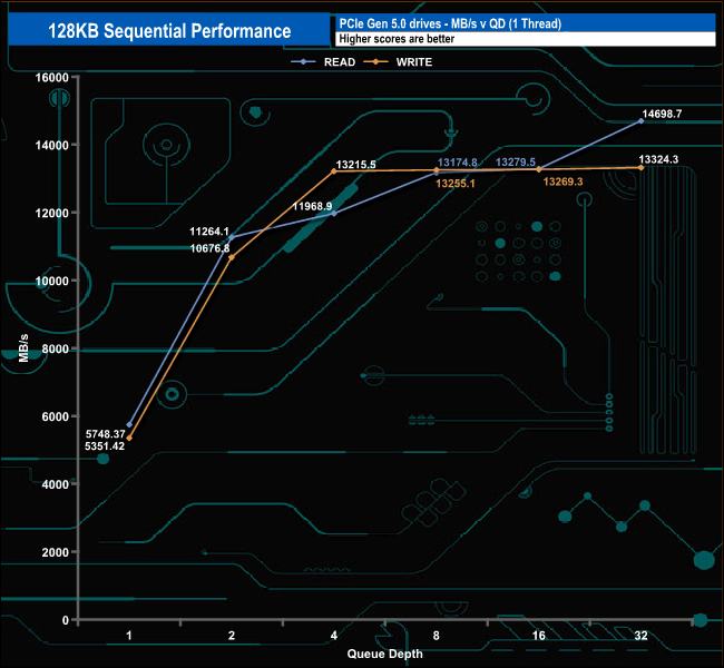 We used CrystalDiskMark 8‘s custom settings to test the Sequential read and write performance of the drive through a range of queue depths. The setup for the tests is listed below.