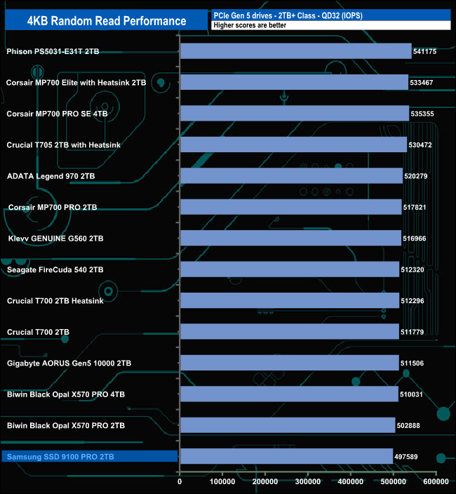 Even though our 4K random read test results were nowhere close to the official maximum figure at any stage, the drive sits in the top spot at QD1, 2 and 4, by quite a margin. This is very useful as these are the queue depths where most of the everyday usage occurs. However, at QD32 it has fallen down the chart to end up in last place.