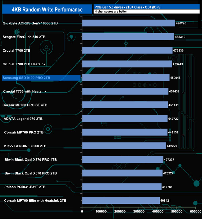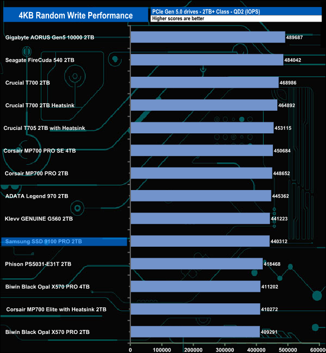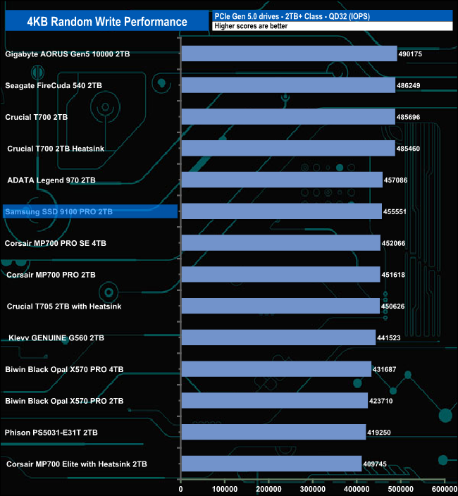 The best result we saw from our 4K random write results was even further away from the official maximum IOPS figure (2,600,000 IOPS) than the random reads. The drive peaked in this test at QD8 with a test figure of 461,228 IOPS before gradually dropping back to finish the test run at QD32 with a figure of 455,551 IOPS.