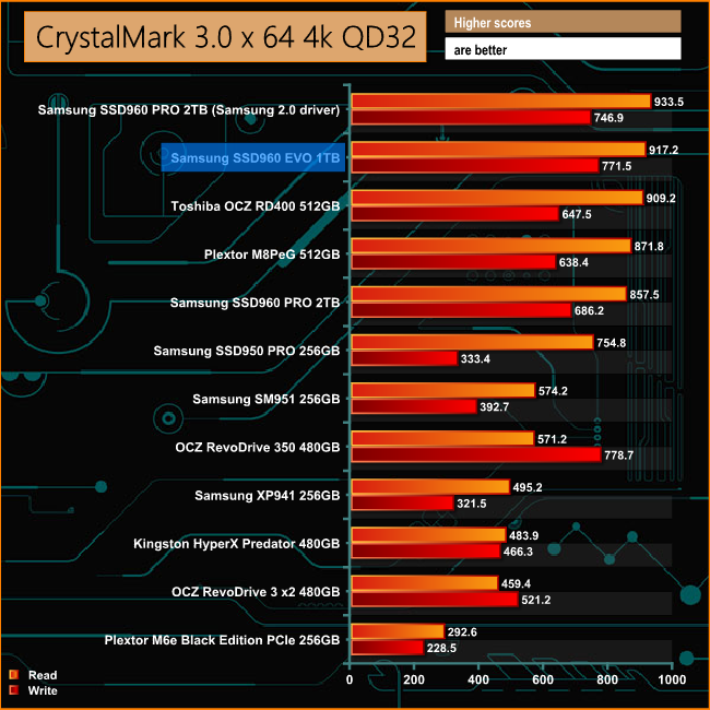 At deeper queue depths the SDD960 EVO performs very well with the Intelligent TurboWrite technology giving the write performance a small boost over the SSD960 PRO. The new Samsung 2.0 driver boosts the SSD960 PRO's performance in both read and writes.
