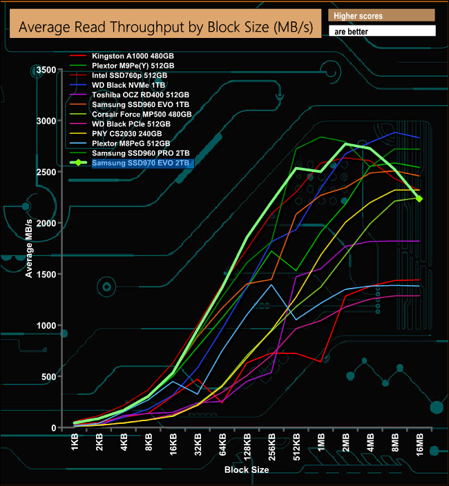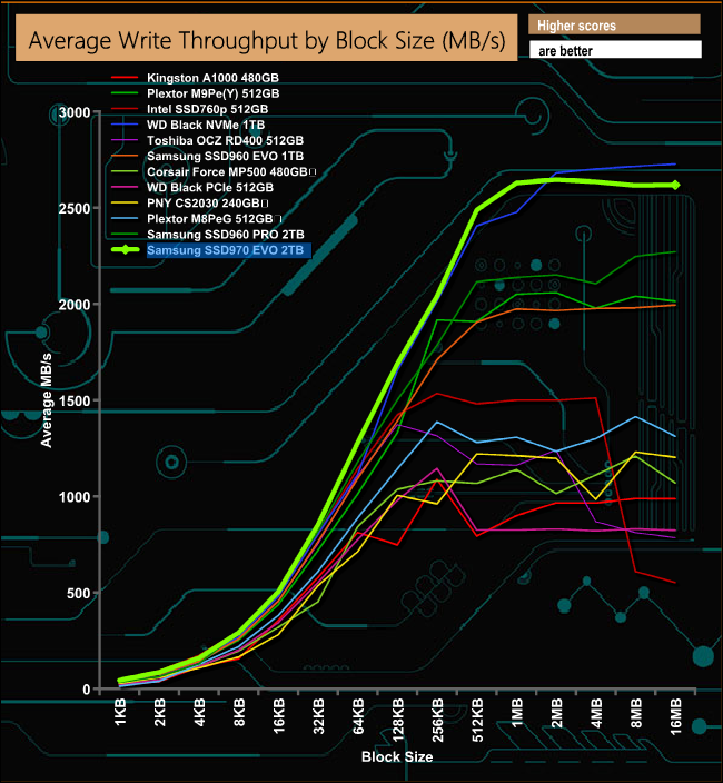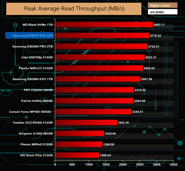 In our throughput tests, the Samsung 970 EVO is the second fastest drive we have tested to date, sitting just below WD's Black NVMe drive.