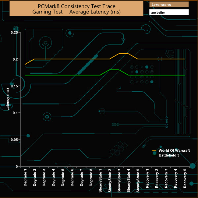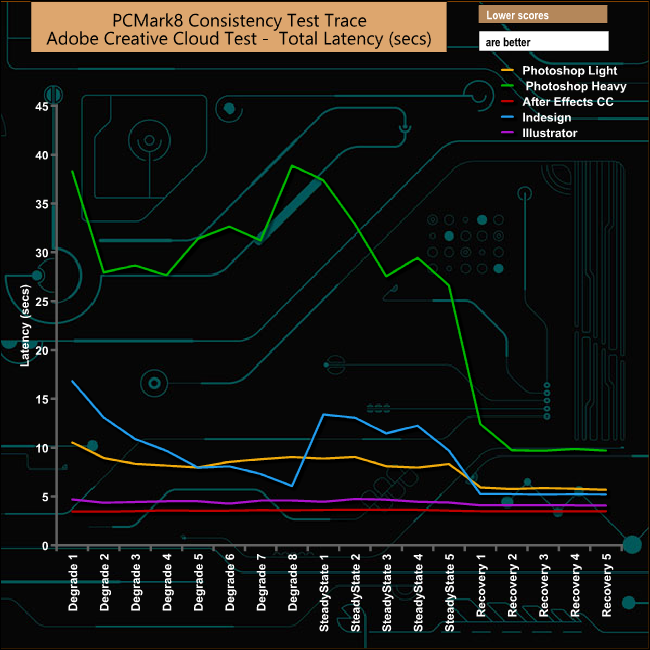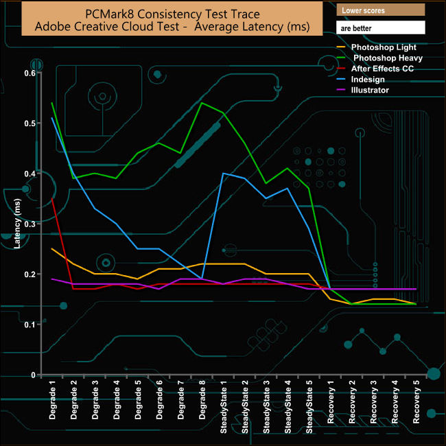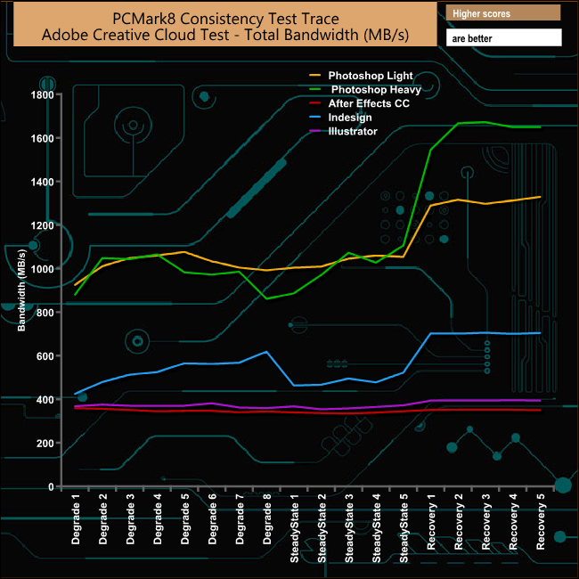 As usual the Adobe Photoshop Heavy test trace stresses the drive the most, but it does recover well during this particular test run. Somewhat unusual is the drop in performance during the Steady State phases of the Indesign test, but once again the performance picks up in the recovery phases.