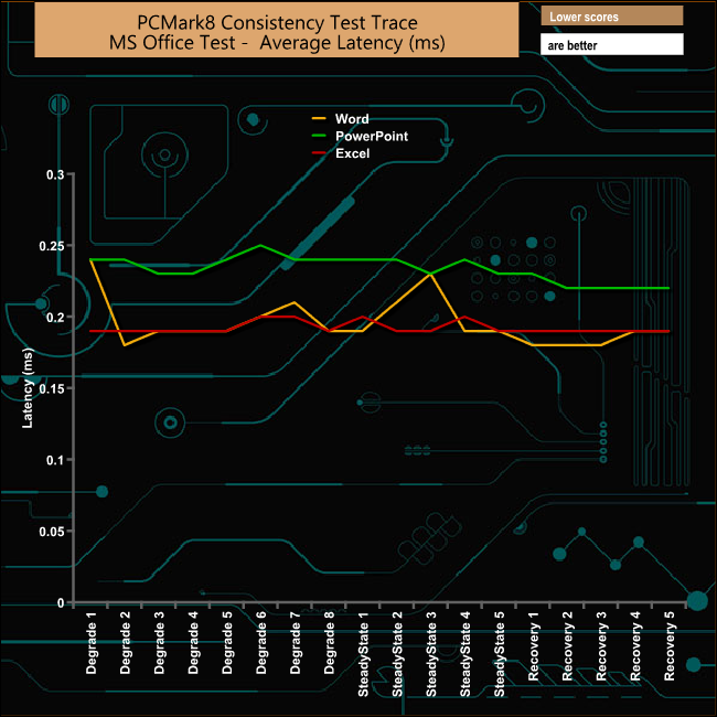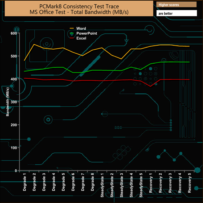 In the Microsoft Office tests it's the Word trace that suffers most during the test run, with the bandwidth dropping noticeably between the first and fourth Steady State phases – from 535MB/s down to 478MB/s. All three traces show a very gradual improvement during the recovery phases.