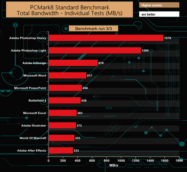 Just like the Consistency test, PCMark 8’s standard Storage test also saves a large amount of performance data. The default test runs through the test suite of 10 applications three times. Here we show the total bandwidth performance for each of the individual test suites for the third and final benchmark run.
