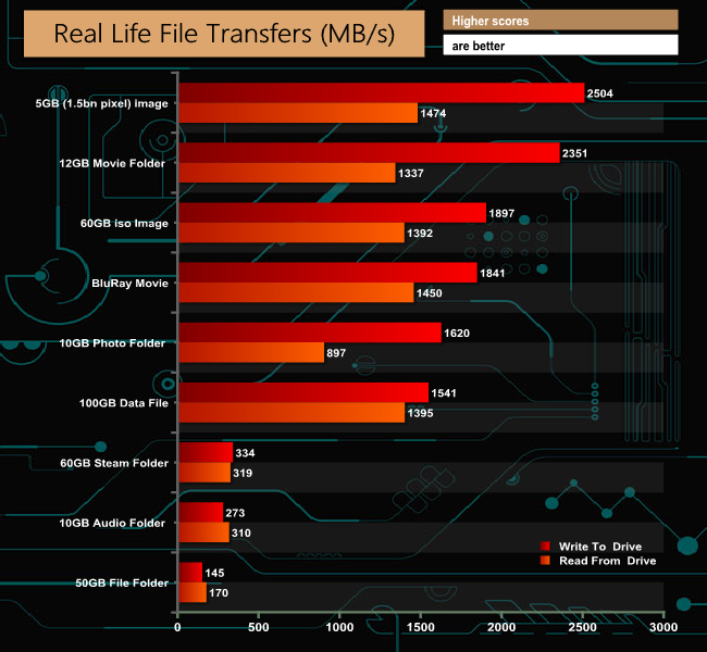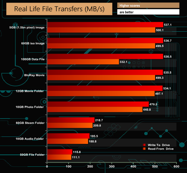The drive handles large file sizes a lot more effectively than smaller ones, as can be seen by the 500MB/s+ figures for the tests made up of larger files (ISO image, Blu Ray movie etc).