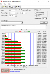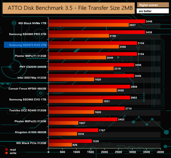Samsung's official sequential read/write figures for the 2TB SSD are up to 3,500MB/s and 2,500MB/s respectively. When tested with the ATTO benchmark our review drive came up a little short of the maximum read figure at 3,154MB/s, while the write figure was right on the money with 2,506MB/s.