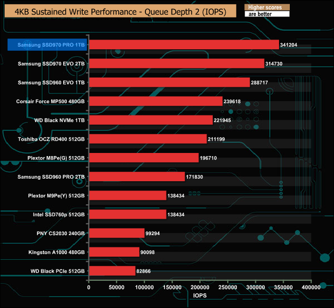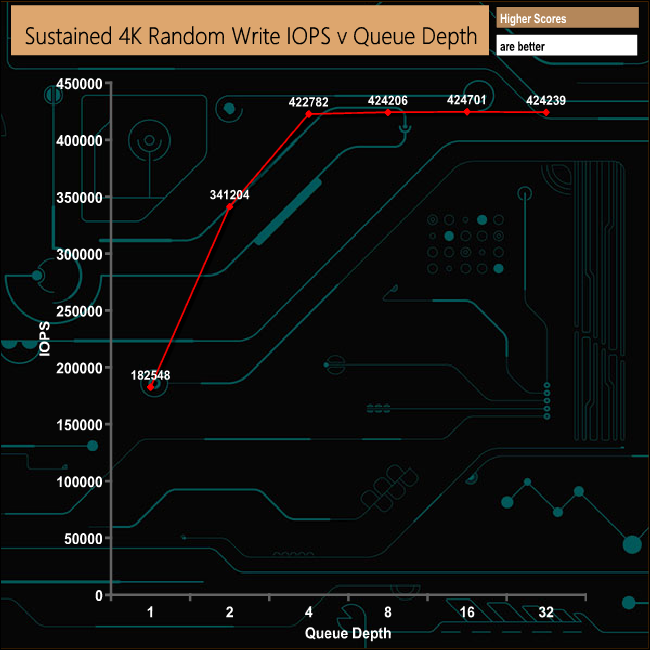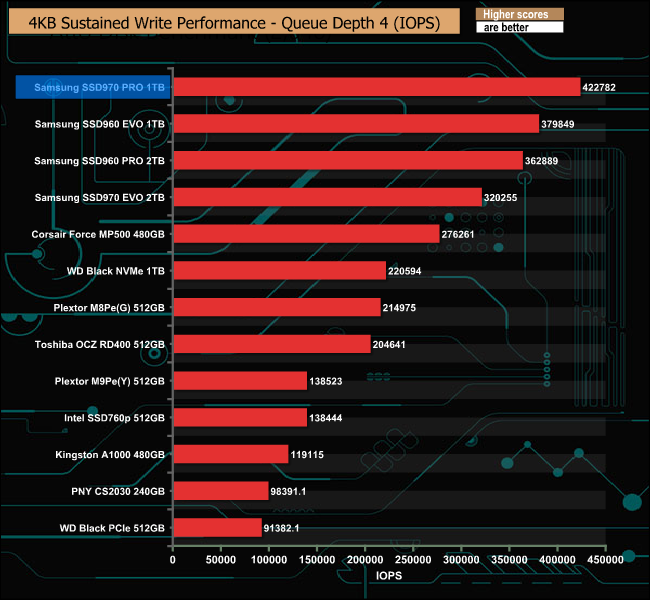 Samsung quotes a maximum 4K random write figure of 500,000 IOPS for the 970 PRO, a figure we couldn't match in our tests, with the review drive producing 424,239 IOPS.