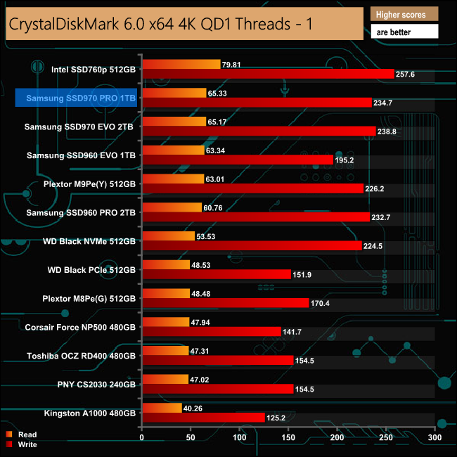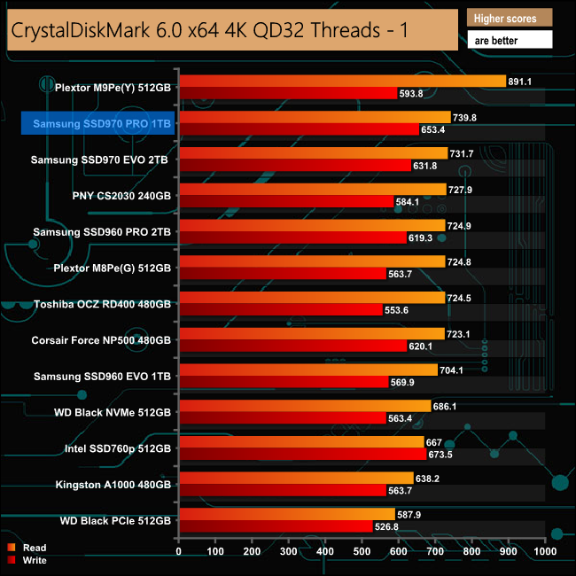 The 970 PRO shows strong performance in the CrystalDiskMark benchmark at both shallow and deep queue depths. Looking at the two benchmark result screens (default and 0 fill), the new Phoenix controller has no preference as to which data it's being asked to deal with.