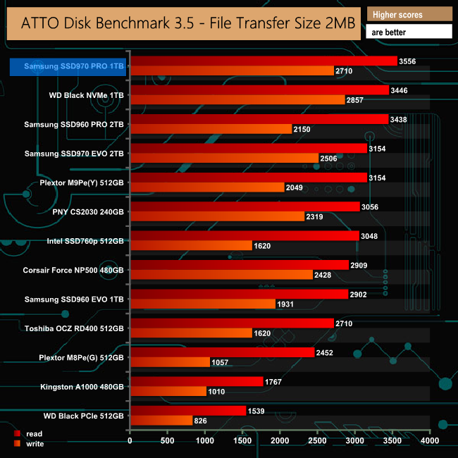 WD's reign as the fastest consumer drive we have seen to date is over, at least when it comes to read speeds in the ATTO benchmark. The new Samsung 970 PRO takes over with a sequential read score of 3,556MB/s which is a wee bit faster than the official maximum figure of 3,500MB/s. However, when it comes to writes, the Samsung drive's 2,710MB/s matches the official figure, but falls short of the WD Black NVMe's 2,857MB/s.
