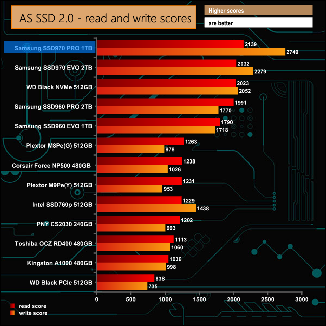 In the AS-SSD benchmark, the 970 PRO produces the fastest read and write scores for a consumer drive we've seen to date. The write score of 2749 is impressive.