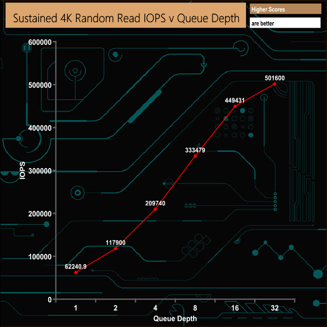 Samsung quotes a maximum 4K random read rate of 500,000 IOPS at a queue depth of 32 and with 4 threads, a number we could confirm with our test; the tested drive producing 501,600 IOPS.