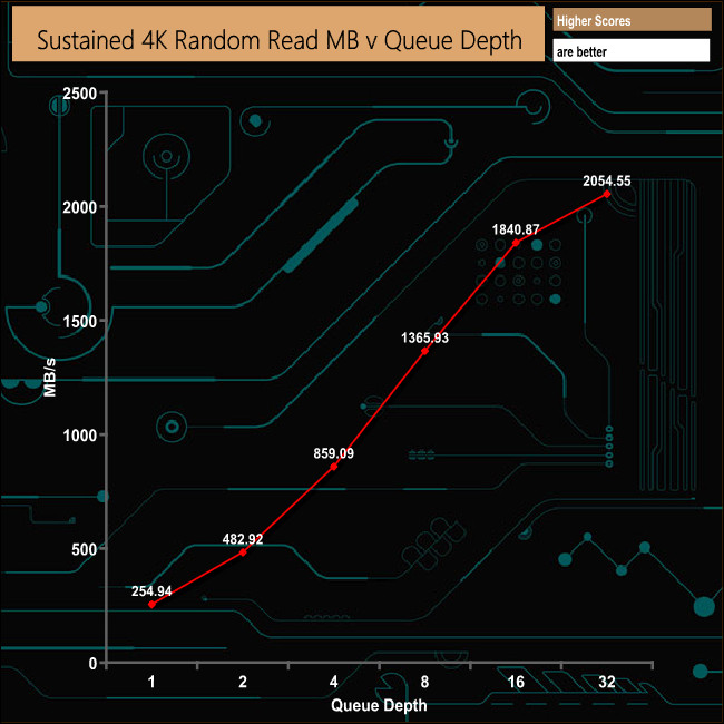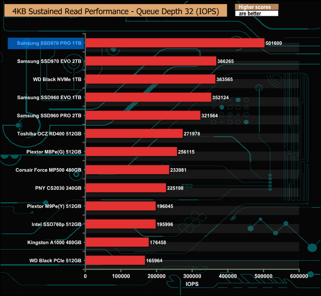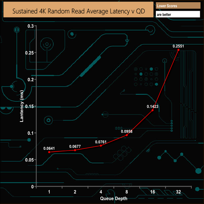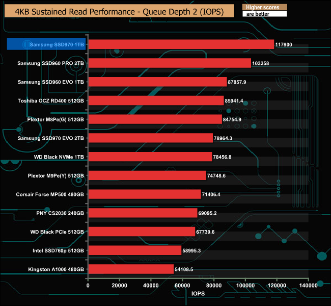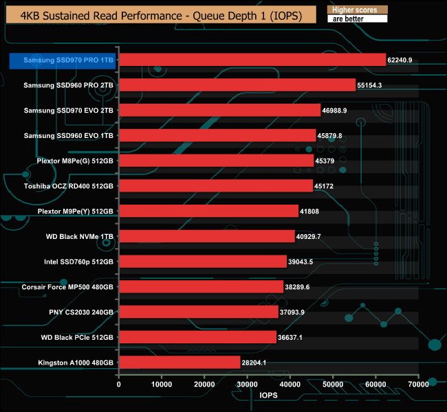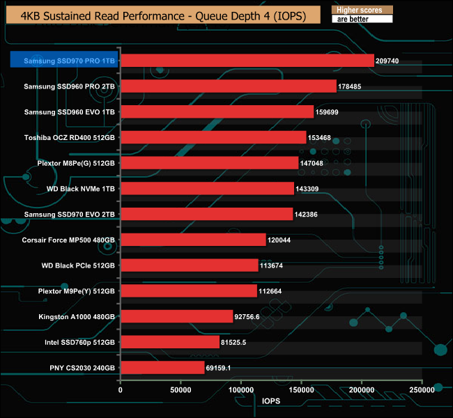 At all queue depths the Samsung 970 Pro 1TB drive reigns supreme when it comes to 4K random reads.