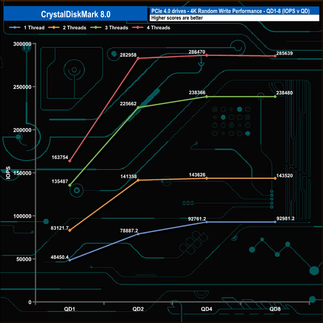 We used CrystalDiskMark 8 to test the random performance of the drive at lower queue depths (QD1 – QD8 where most of the everyday workloads occur) using 1 to 4 threads.