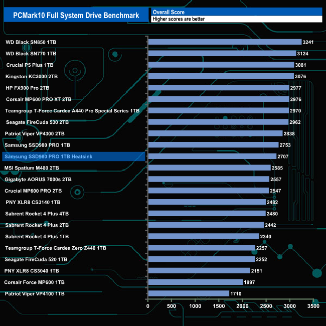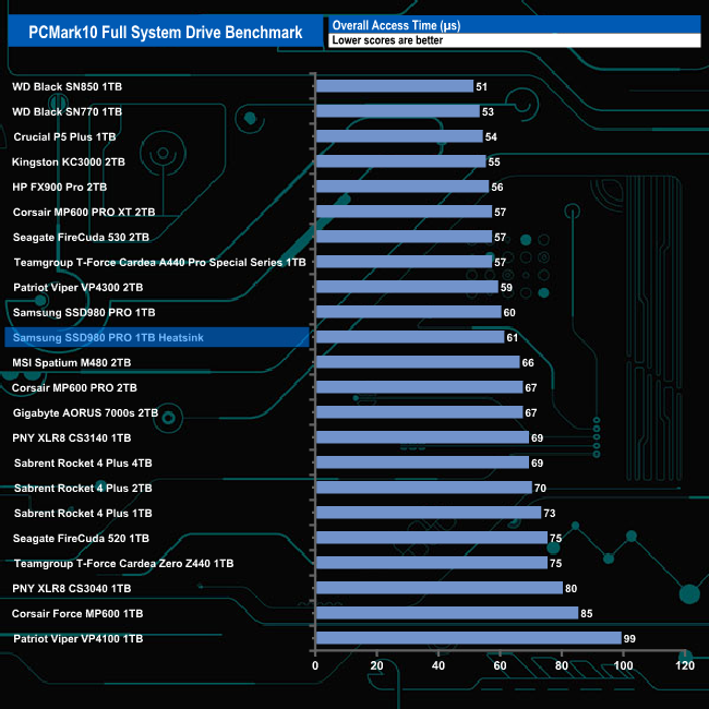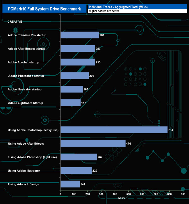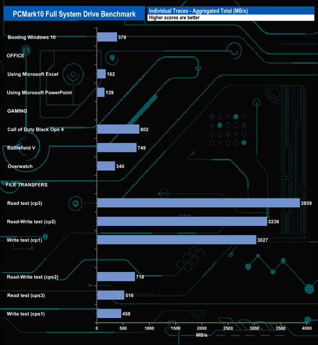 The PCMark 10 Full System Drive Benchmark uses a wide-ranging set of real-world traces from popular applications and common tasks to fully test the performance of the fastest modern drives. The benchmark is designed to measure the performance of fast system drives using the SATA bus at the low end and devices connected via PCI Express at the high end.