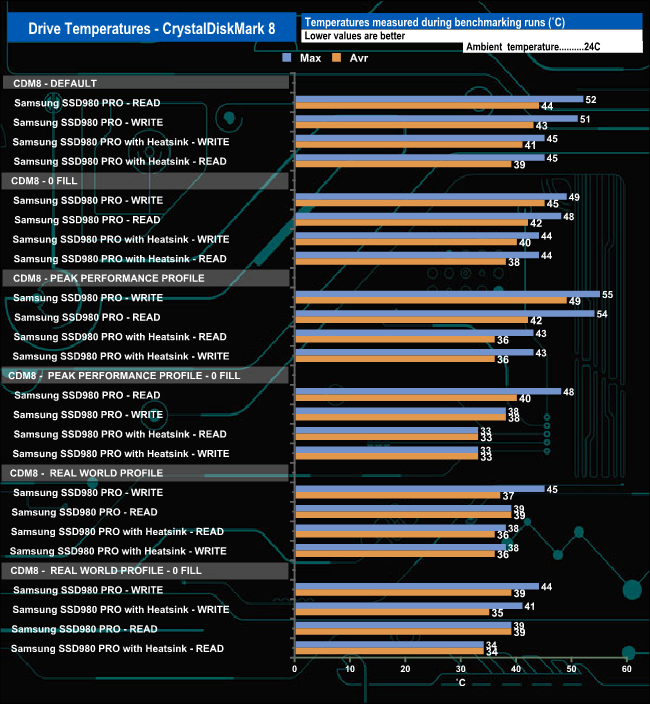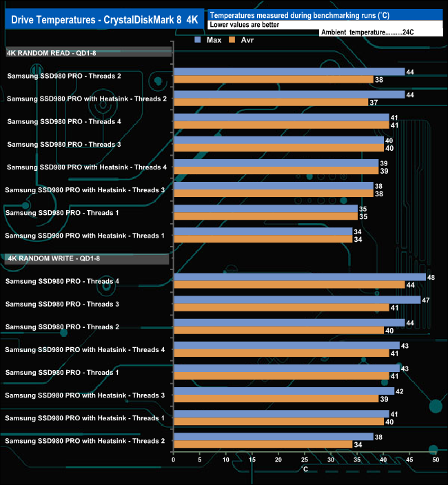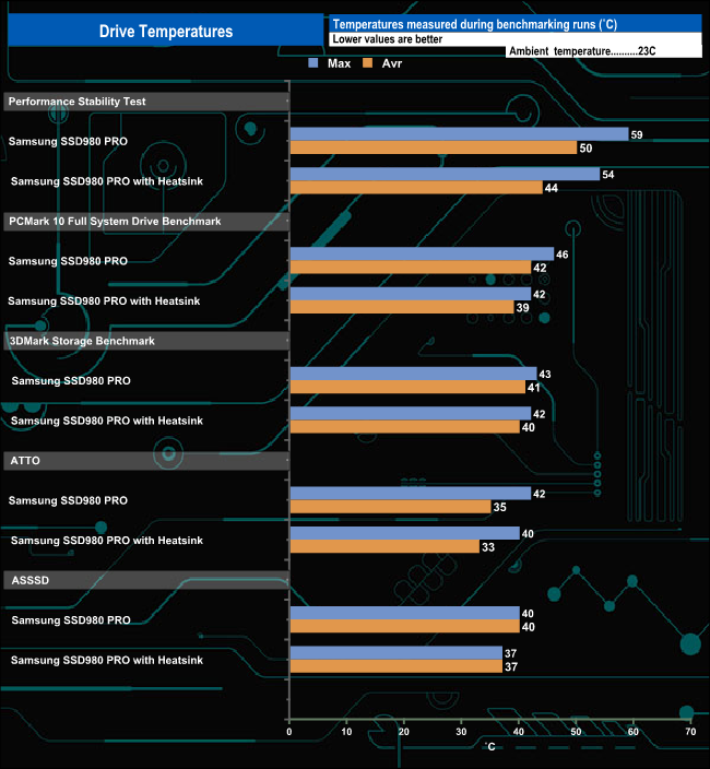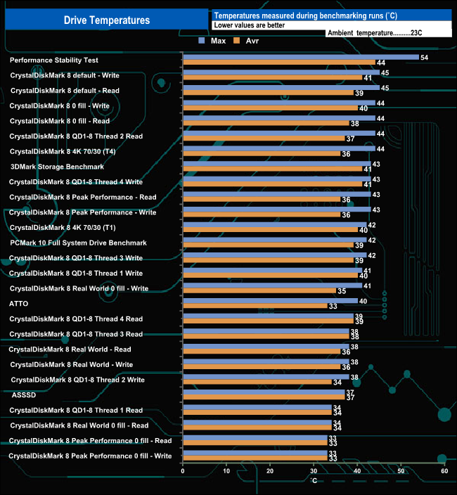 We took note of the drive’s temperature during some of our benchmarking runs. The heatsink works well enough as the hottest the drive got was 54° C when being pushed very hard during the Performance Stability test. For the bulk of our testing the temperature averaged around 40° C, comfortably below the maximum operating temperature of 70C.
