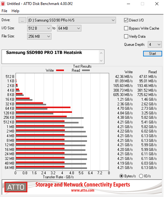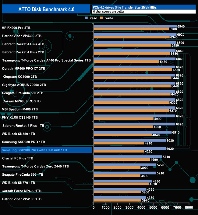 Using the ATTO benchmark we couldn't quite hit the top Sequential figures of 7,000MB/s and 5,000MB/s read and write respectively with test results of 6,020MB/s for reads and 4,220MB/s for writes, pretty much the same figures as the standard 980 Pro.