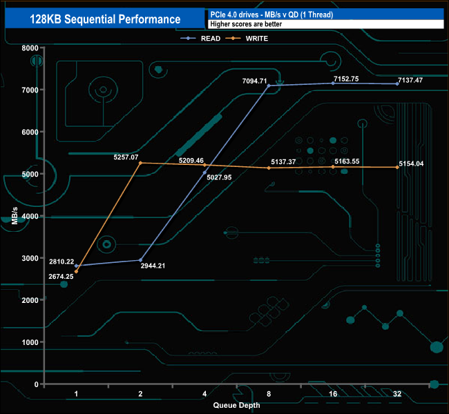With these Sequential tests, we could confirm the official up to 7,000MB/s read and 5,000MB/s write figures. with the drive producing a peak read figure of 7,152.75MB/s (QD16) with writes peaking at 5,257.07MB/s (QD2).