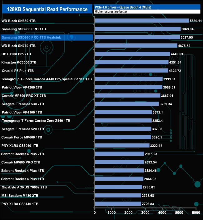 The 980 Pro Heatsink version shadows the standard 980 Pro throughout our Sequential read QD testing.