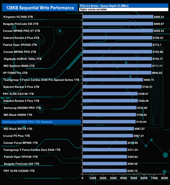 In our Sequential write tests, the Heatsink version of the drive leads the standard drive in QDs 1 and 2, but as the queue depth deepens the drives swap around with the standard 980 leading the way.
