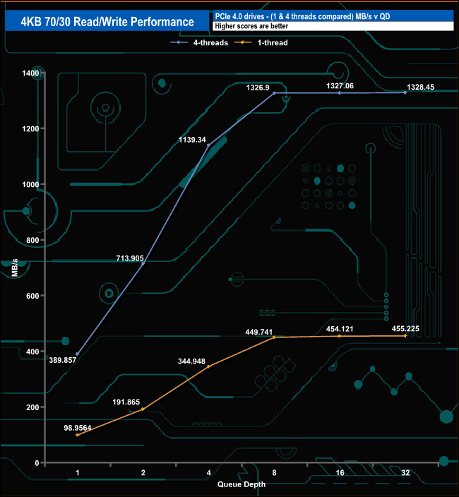 We used CrystalDiskMark 8’s custom settings to test the 4K 70/30 mixed read/write performance of the drive through a range of queue depths using a single thread and four threads.