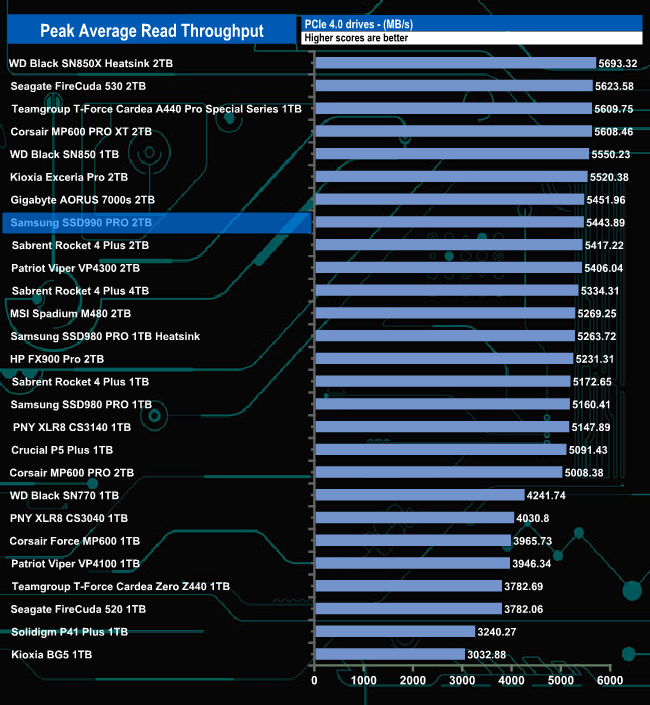 In our read-throughput test the drive peaked at the 8MB block mark at 5,443MB/s, quite some way short of the official maximum of 7,450MB/s. However, it was 180MB/s faster than the heatsink version of the previous generation SSD 980 Pro and 283MB/s faster than the standard SSD 980 Pro.
