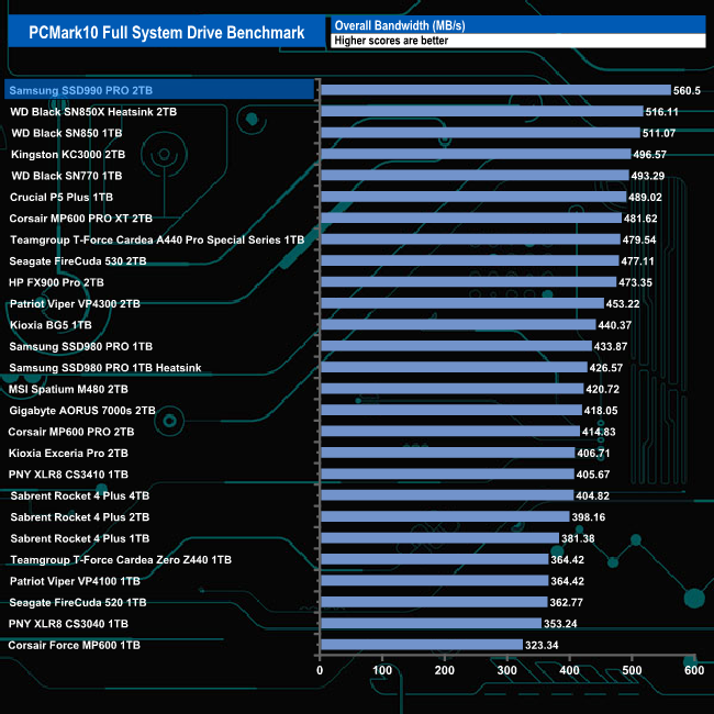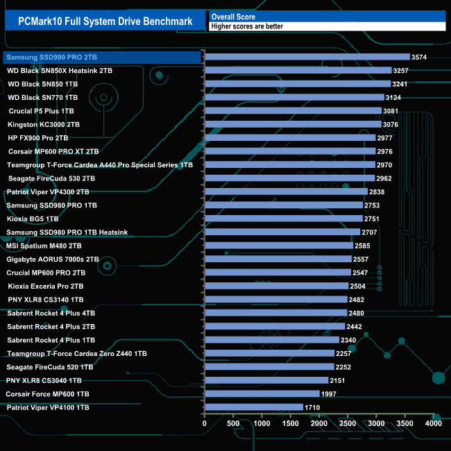 The best result from the 2TB Samsung 990 Pro in PCMark10’s Full System Drive Benchmark was the 1,072MB/s for the Heavy Use Adobe Photoshop trace. The file transfer tests also Produced a very good cp1 (write test) figure of 4,292MB/s backed up by the 4,175MB/s for the cp3 (read test) and 3,779MB/s for the cp2 read/write test traces.