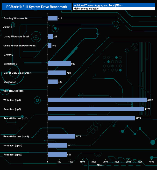 The PCMark 10 Full System Drive Benchmark uses a wide-ranging set of real-world traces from popular applications and common tasks to fully test the performance of the fastest modern drives. The benchmark is designed to measure the performance of fast system drives using the SATA bus at the low end and devices connected via PCI Express at the high end.