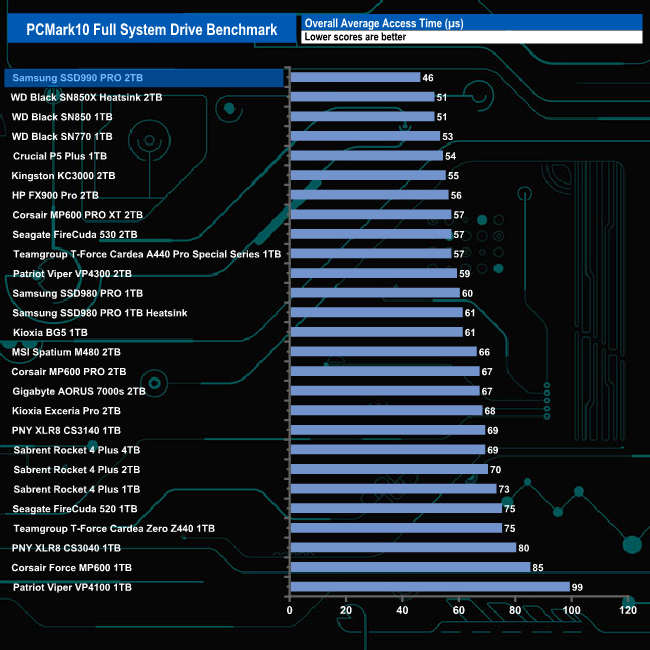 The 990 Pro is the fastest consumer drive to date we've seen using the PCMark 10 Full System Drive Benchmark. Its overall bandwidth figure of 560MB/s is some 127MB/s and 134MB/s faster than the standard and heatsink-equipped SSD 980 Pro respectively. It's also much quicker when it comes to access speed. At 46μs it's 14μs faster than both versions of the SSD 980 Pro.
