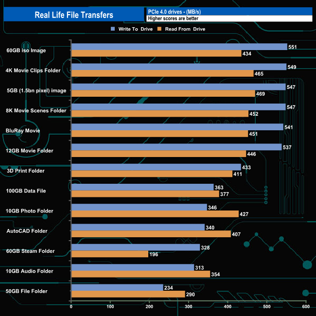 The 990 Pro handled our real-life file transfers without any Problems, particularly when dealing with the larger file size transfers, averaging 545MB/s for writes and 452MB/s for reads when dealing with these file types.