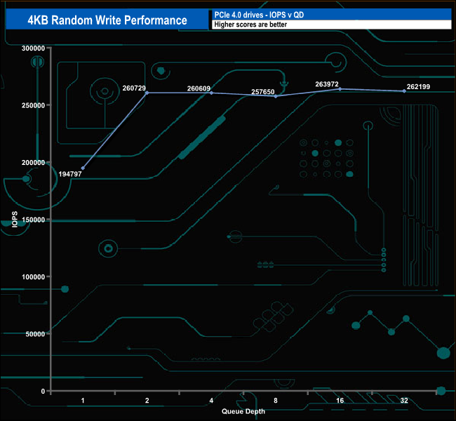The best result we saw from our 4K random write results was 263,972 IOPS at QD16 before the performance dropped back at QD32 at 252,199 IOPS, both of these figures are nowhere near the official maximum.