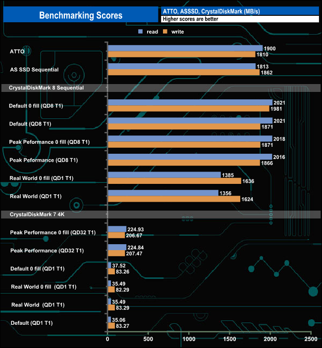 However using CrystalDiskMark default Sequential tests we got a read result of 2,021MB/s, 21MB/s faster than the official figure, while the write result came in at 1,871MB/s, a little short of the official maximum.