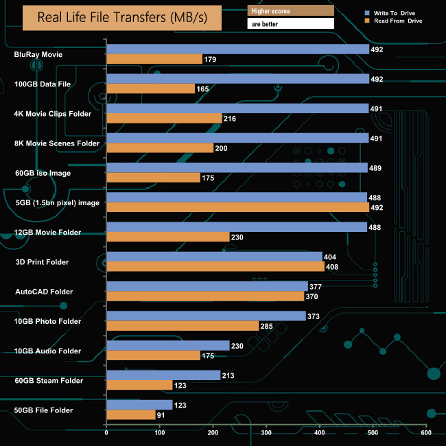 The Samsung SSD 870 EVO handled our life file transfer tests without any real problems, with most of the larger file size write transfers nudging 500MB/s mark. As is usually the case, the small files in the 60GB Steam, 50GB file and 10GB audio folders caused the performance to drop quite considerably.
